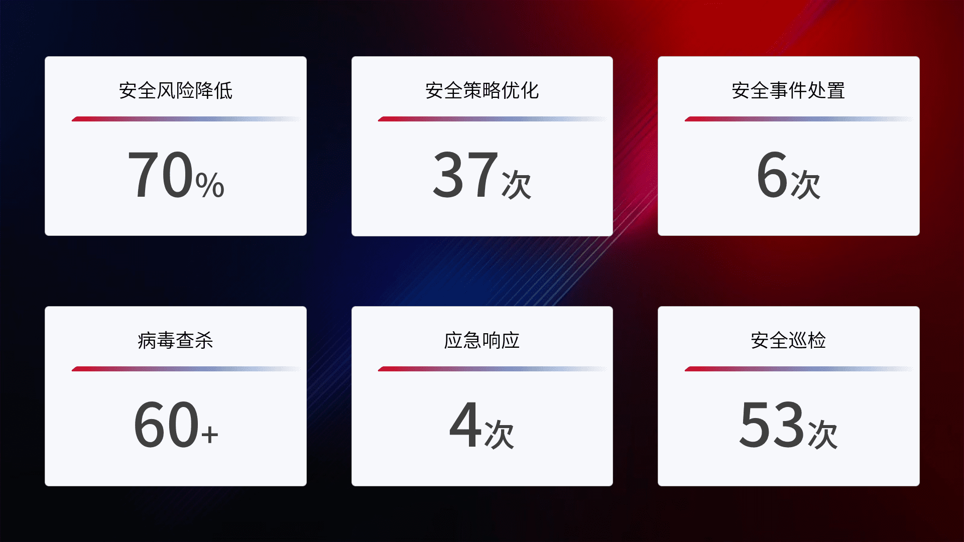 提供全面的安全事件报告体系,,包括处置报告、、、、周报、、、季度和年度总结,,结合持续监控,,,,帮助客户深入了解网络安全状况。。