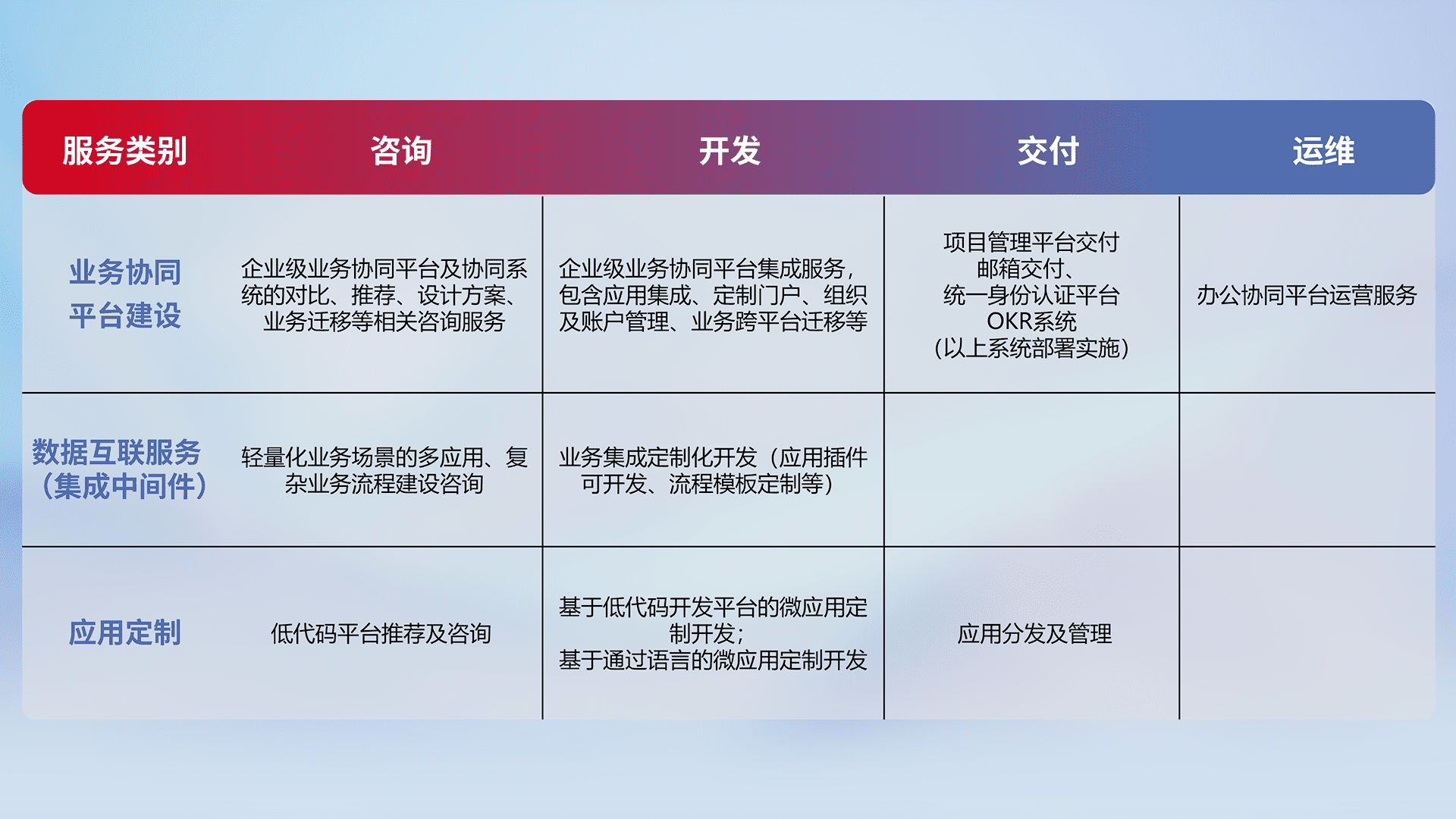 针对钉钉、、、、企微、、、IDaas等平台级产品提供产品的规划、、方案、、、交付、、定制化开发等服务,,,,实现如统一协同办公、、、智能客户服务、、、混合会议管理、、、、智能数据查询、、等业务场景,,实现数字化转型。。